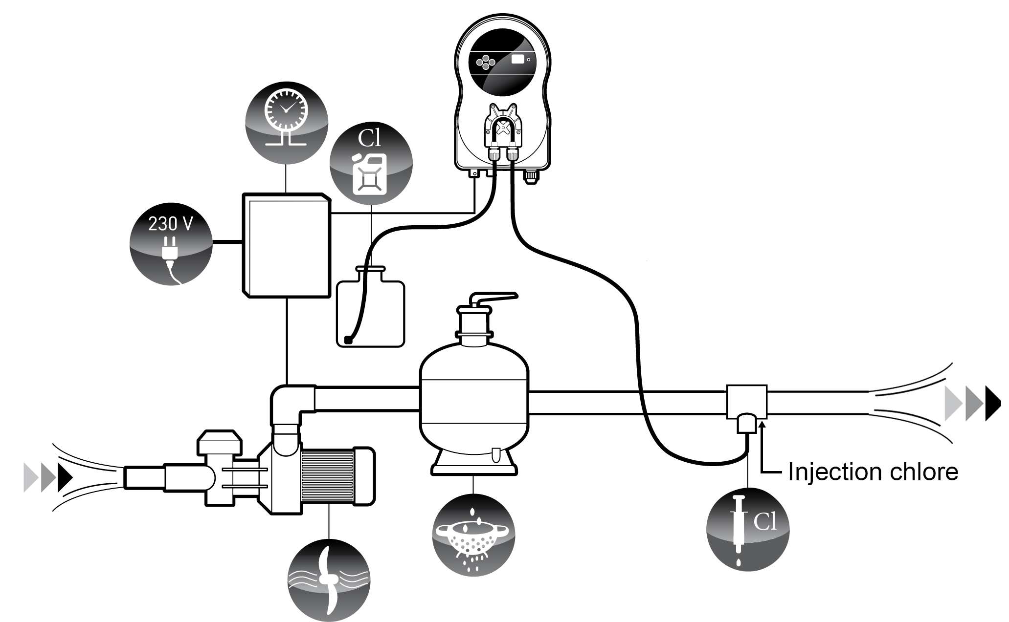 • Dosage automatique du désinfectant : réglage de la dose horaire en fonction du volume de la piscine et du temps de filtration.